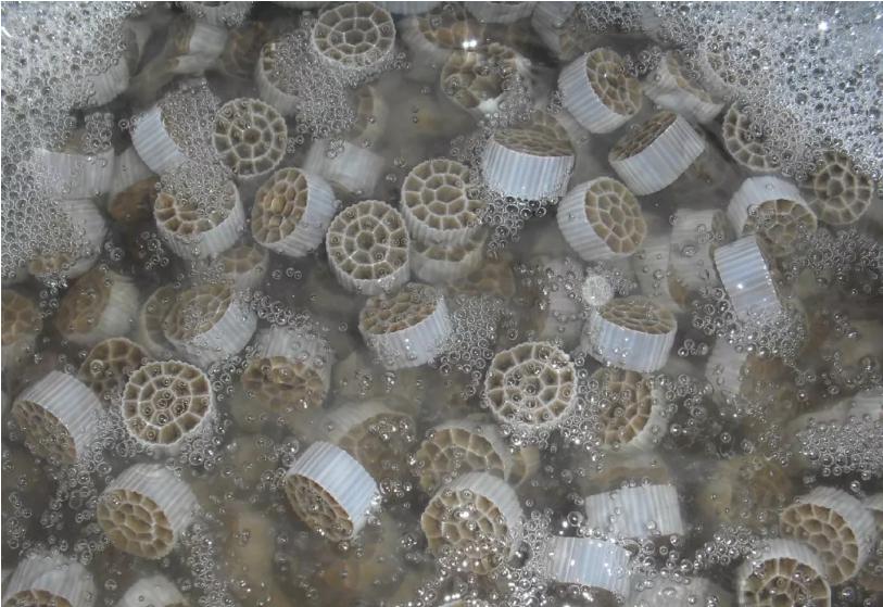 載體在水中的碰撞和剪切作用,使空氣氣泡更加細(xì)小,增加了氧氣的利用率。另外,每個(gè)載體內(nèi)外均具有不同的生物種類,內(nèi)部生長一些厭氧菌或兼氧菌,外部為好氧菌,這樣每個(gè)載體都為一個(gè)微型反應(yīng)器,使硝化反應(yīng)和反硝化反應(yīng)同時(shí)存在,從而提高了處理效果。